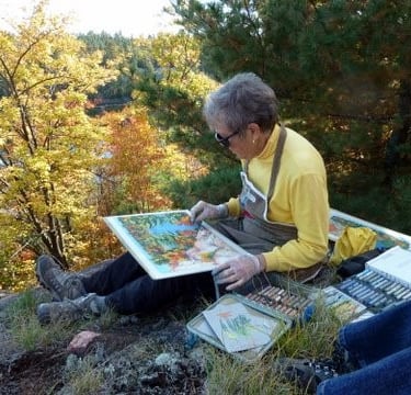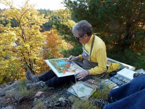 Marlies finds the simplicity of soft pastels a most satisfying medium to use in the summer. They fit easily into a backpack and travel well in a canoe or kayak. In the winter she paints with acrylics in her lakeside studio (Frogpond Studio) outside Sudbury.